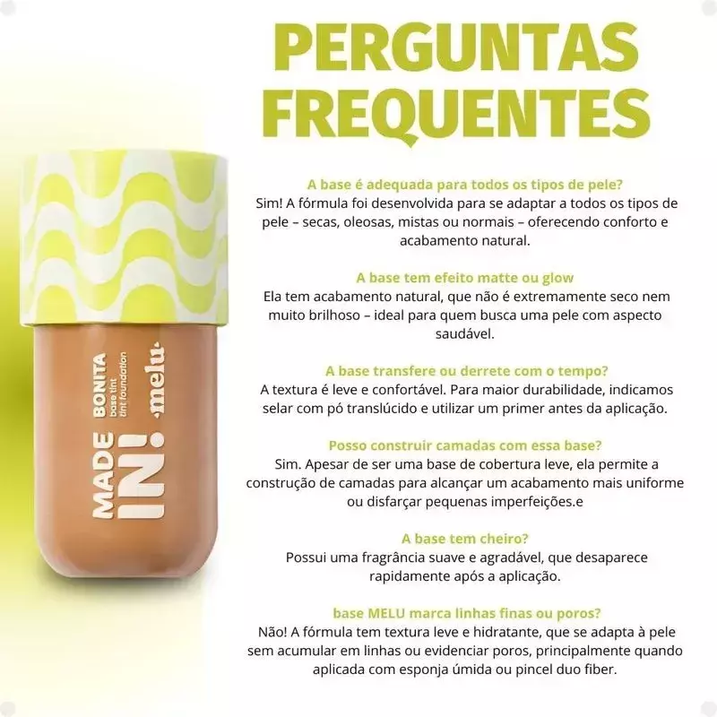 A Base Tint Bonita Made In! - Melu by Ruby Rose é a escolha perfeita para quem busca uma pele radiante e natural. Enriquecida com Ácido Hialurônico e Niacinamida, ela hidrata profundamente enquanto uniformiza o tom da pele, proporcionando um acabamento leve e fresco.