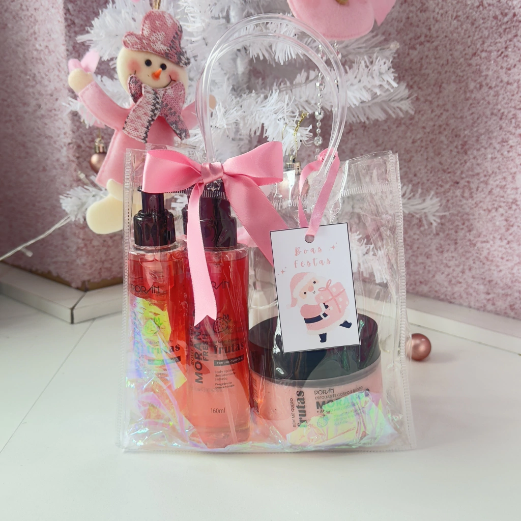 Kit Presente Natal - Morango Poran é a escolha ideal para encantar quem você ama neste Natal! Este kit completo, exatamente como mostrado na foto, vem com um esfoliante, um sabonete, um hidratante e um Body Splash de Morango, todos da renomada marca Poran.