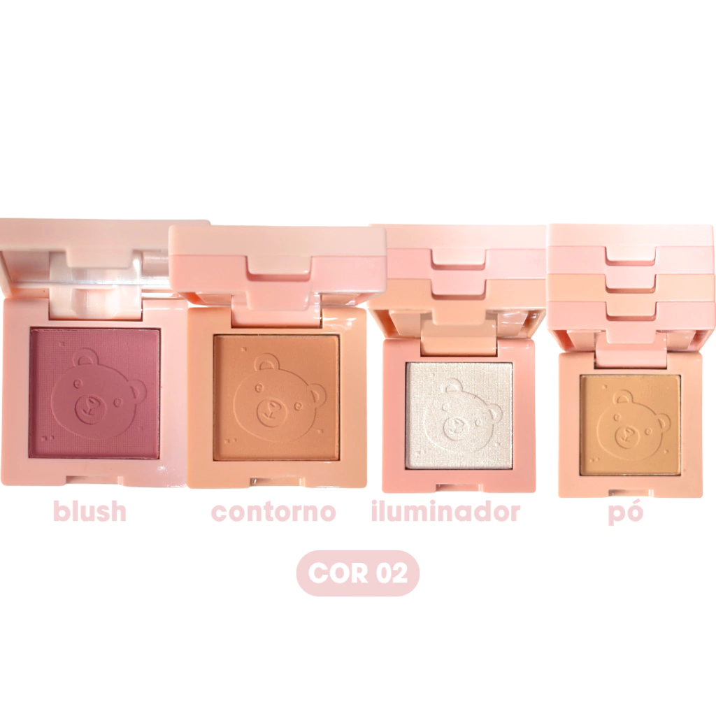 4 em 1: blush, contorno, iluminador e pó compacto.